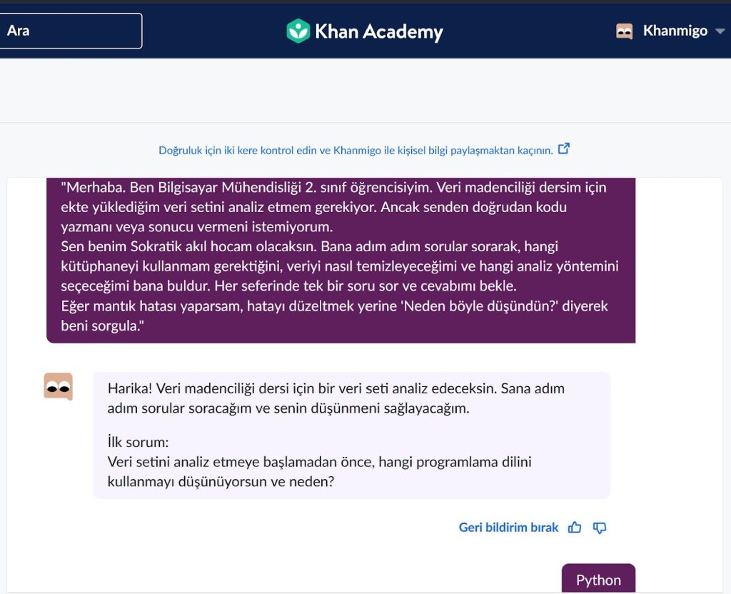Khanmigo ortamında bu komut çalıştırıldığındaki ekran görüntüsü Şekil 1’de verilmiştir. Khanmigo öğretmenler için ücretsizdir. Hesap açıldığında her ne kadar ülkemizden kullanıma izin verilmediği uyarısı çıksa da çalıştırılabilmektedir.