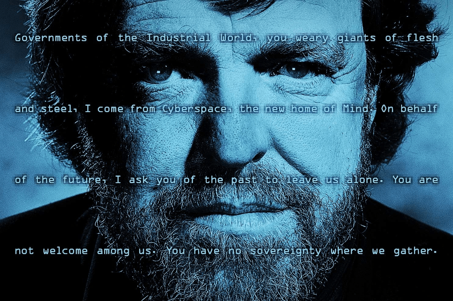 Endüstriyel dünyanın hükümetleri, siz etten ve çelikten yapılmış yorgun devler! Ben Siber Alem’den, zihnin yeni evinden geliyorum. Geleceğin temsilcisi olarak, geçmişte kalan sizlerden bizi rahat bırakmanızı istiyorum. Aramıza hoş gelmediniz. Bir araya geldiğimiz bu alemde artık sizin hiçbir egemenliğiniz yok.”